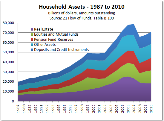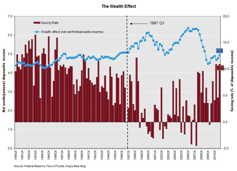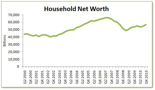 Complete Story » | | | | | | | | | | | | | | |  |  |  | | | | | | | | The Angry Bear submits: by Rebecca Wilder The Federal Reserve released the Q4 2010 Flow of Funds Accounts for the US. On the household balance sheet, net worth (total assets minus total liabilities) was estimated at $56.8 trillion, which is up $2.1 trillion over the quarter. Notably, household net worth has increased $6.4 trillion since the recession's end (Q2 2009). Moreover, personal disposable income increased another $918 billion over the quarter, which dropped household leverage (total liabilities/disposable income) 1.1% to 116%. Click on all charts to enlarge: