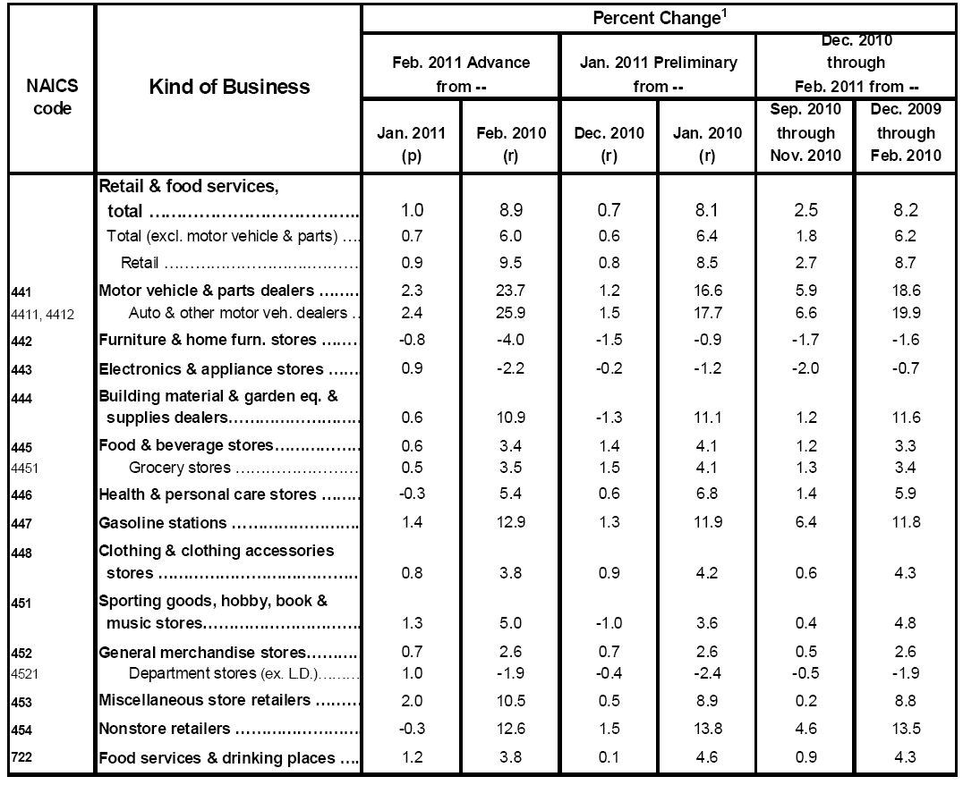 LEAP fell 4.99 percent to $13.01 in late morning trading. Yesterday it rallied more than 9 percent after a major shareholder said it was trying to shake up its board of directors. The investor, Pentwater Capital Management, said the company has mismanaged its cost structure and handset inventory. It also questioned LEAP's strategic focus on broadband services. Pre-paid wireless carriers Complete Story » | | | | | | | | | | | | | | |  |  |  | | | | | | | | Morningstar submits: While it is easy to visualize what pharmaceutical firms or medical device firms produce, the life science segment seems a little hazier to investors. We do not encounter its products in daily life, nor do we usually see them in the doctor's office. Life science firms produce equipment and consumables (such as tests and reagents) for use in research, applied markets, and diagnostic labs. Research customers come from government and university laboratories as well as from the development arms of large pharmaceutical and biotechnology companies. Life science products also trickle down into the applied market for use in forensics, agriculture, and environmental testing. These firms also make products for molecular diagnostics to detect mutations or strains of viruses, like the H1N1 flu. While we don't currently have any 5-star calls in our life science coverage universe, we still view the market as attractive and have outlined our broad expectations for Complete Story » | | | | | | | | | | | | | | |  |  |  | | | | | | | Hickey and Walters (Bespoke) submit: Last week the S&P 500 (SPY) and five of its sectors were trading in overbought territory. After a week of declines, the S&P 500 is now below its 50-day moving average, while two sectors are overbought and two are oversold. The two sectors that remain overbought are both defensive in nature -- Consumer Staples and Utilities. Technology and Materials are the two sectors that have moved into oversold territory. The Materials sector is the one that saw the biggest swing from positive to negative over the last week. It was very close to overbought territory last week, but now it is more than two standard deviations below its 50-day moving average. So how does underlying breadth look? Below are charts for the S&P 500 and its ten sectors showing the percentage of stocks trading above their 50-day moving averages. In the S&P 500, 53% of stocks are currently trading above Complete Story » | | | | | | | | | | | | | | |  |  |  | | | | | | | | Andrew Wilkinson submits: Energy Select Sector SPDR ETF (XLE) – Options volume on the XLE jumped following the opening bell this morning, with most of the activity concentrated in April contract puts. It looks like one big player kicked things off in the first 20 minutes of the session by unraveling a massive bear put spread on the fund. Shares in the XLE rose sharply today, gaining as much as 1.95% in early afternoon-trade to hit $75.27 by 12:20pm. The trader responsible for the largest put spread print certainly seems to have a keen sense of timing, initiating the debit put spread near the XLE's top, and taking the spread down this morning ahead of the intraday move higher. The investor appears to have initiated the spread back on February 28, 2011, when shares in the XLE reached a session-high of $78.69. The big player sat with the trade, watching shares hit fresh Complete Story » | | | | | | | | | | | | | | |  |  |  | | | | | | | | Zacks.com submits: By Dirk van Dijk Retail Sales were in line with high expectations for February. Total retail sales rose 1.0%, and are up 8.9% from a year ago. January was revised up from 0.3% growth to 0.7% growth. That was a major positive surprise.